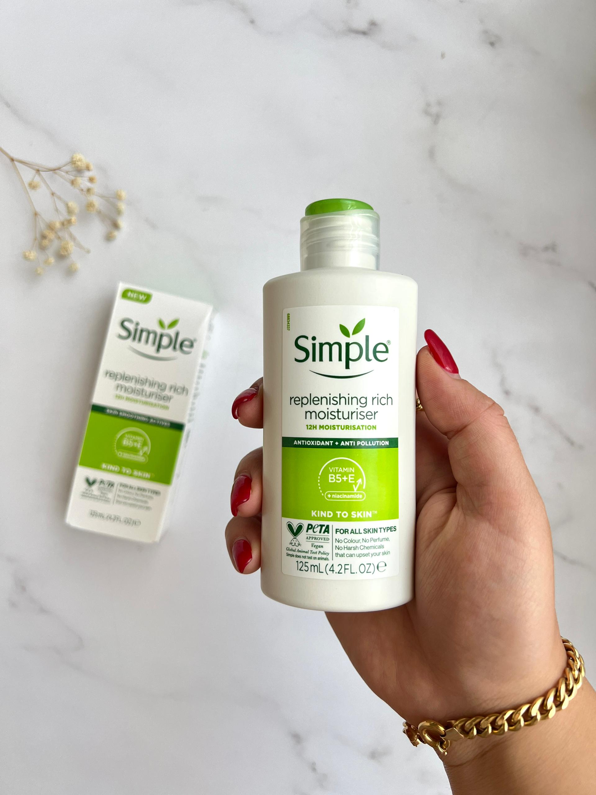 کرم مرطوب کننده و آبرسان پوست ریپلنیشینگ ریچ سری کایند تو اسکین سیمپل یک مرطوب کننده غنی و موثر برای پوست است. این کرم مرطوب کننده صورت که با ترکیبات سازگار با پوست و آب تصفیه شده سه گانه، خالص ترین آب ممکن ساخته شده است، آبرسانی فوری به پوست می دهد. از این رو پوست را تا 12 ساعت آبرسانی و مرطوب می سازد. همچنین ضمن رفع کم آبی پوست مانع خشک و دهیدراته شدن آن خواهد شد. کرم آبرسان و مرطوب کننده صورت سیمپل کایند تو اسکین ریپلنیشینگ ریچ مویسچرایزر پوست را نرم و شاداب می کند.